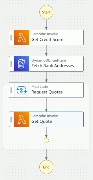 Part 2 of this blog series shows the implementation of the Loan Broker example using AWS Step Functions with a Recipient List. We built the interaction with the Credit Bureau in Part 1 already, so here we focus on the interaction with the banks. Using a Recipient List means that the Loan Broker retrieves a list of banks to request quotes from before making the requests one-by-one. Implemented in Step Functions it looks as follows: